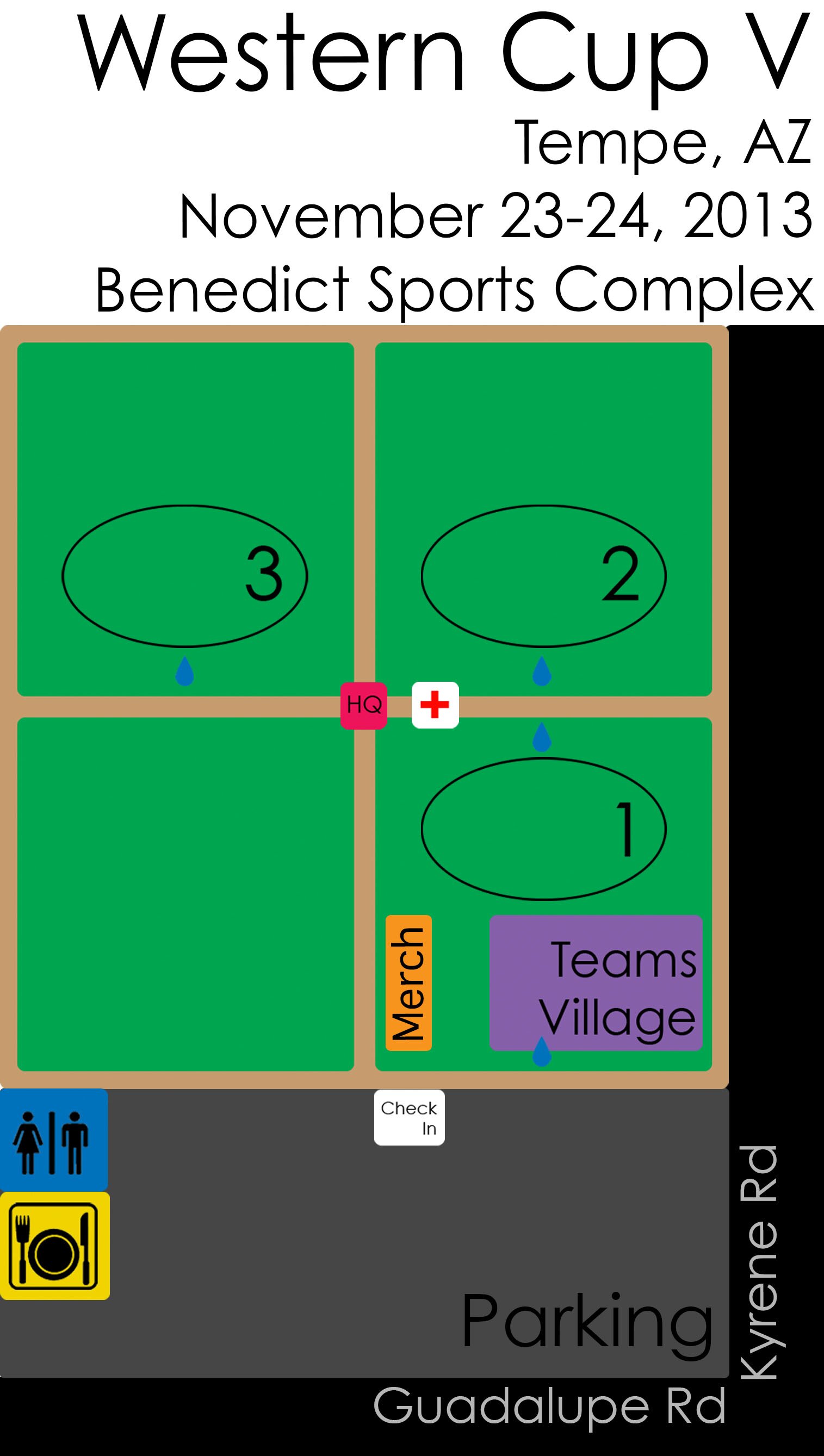 As you can see we'll be running 3 fields this year at Western Cup V. Team village is for PLAYERS ONLY however the rest of the area is open to the public. The food trucks will be parking in a food area in the parking lot. When a schedule is posted, the field assignments will be made clear so you can see all your favorite teams in the easiest fashion.